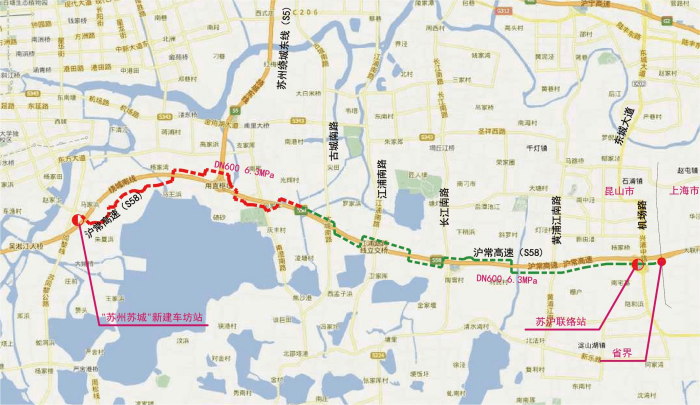 苏州-上海天然气管道联络线工程(昆山段)项目管道起自沪昆交界,终于昆山与吴中交界处。管道全长约20千米,管径为DN600、DN800,设计压力6.3Mpa,采用L415M高等级钢材,年输气量15×108Nm³/a,敷设方式采用开挖直埋、定向钻穿越和顶管穿越。该项目是苏州分公司近年来承监的管道最长、管径最大,也是第二个压力等级为6.3MPa的天然气管道工程。